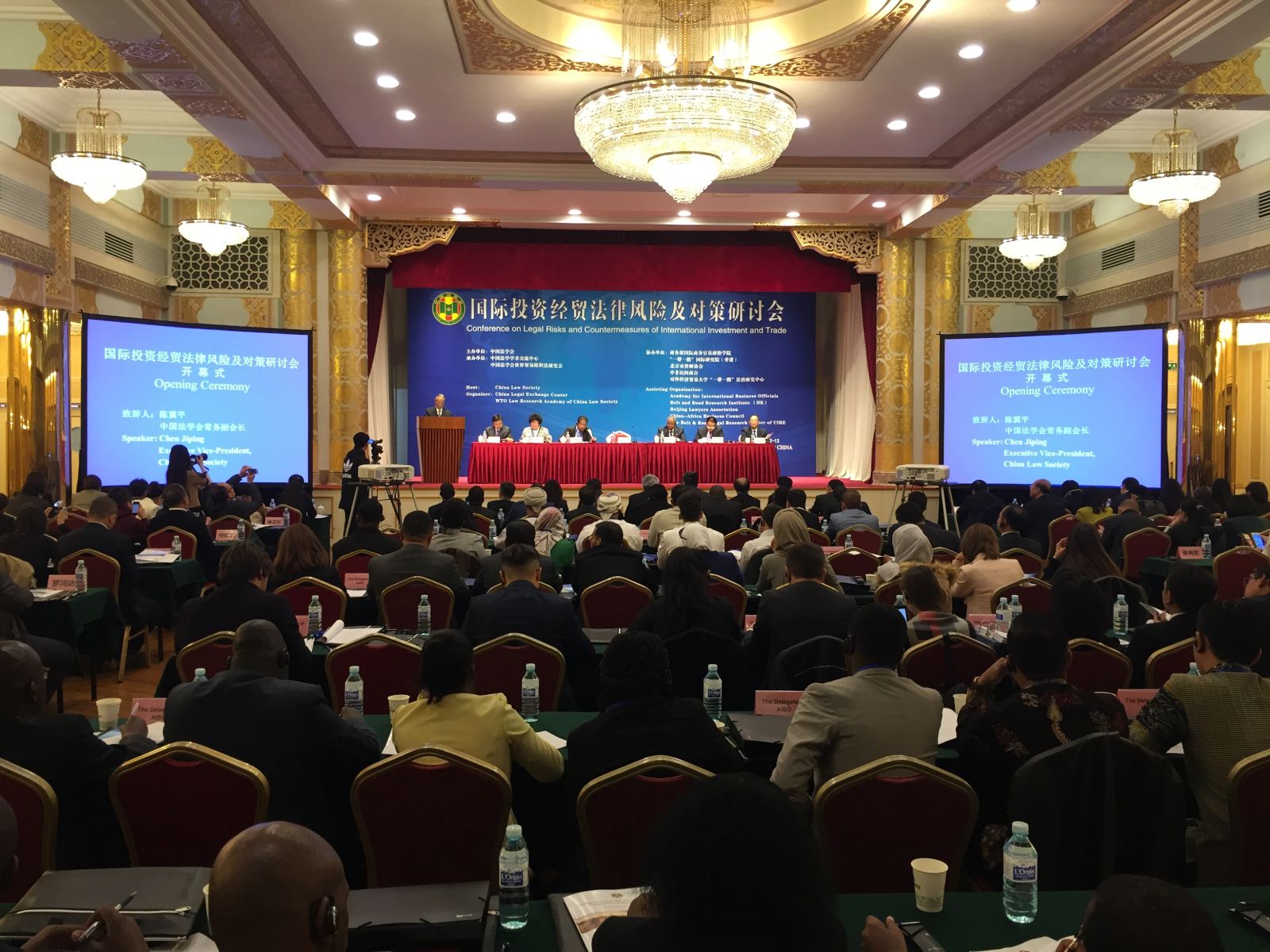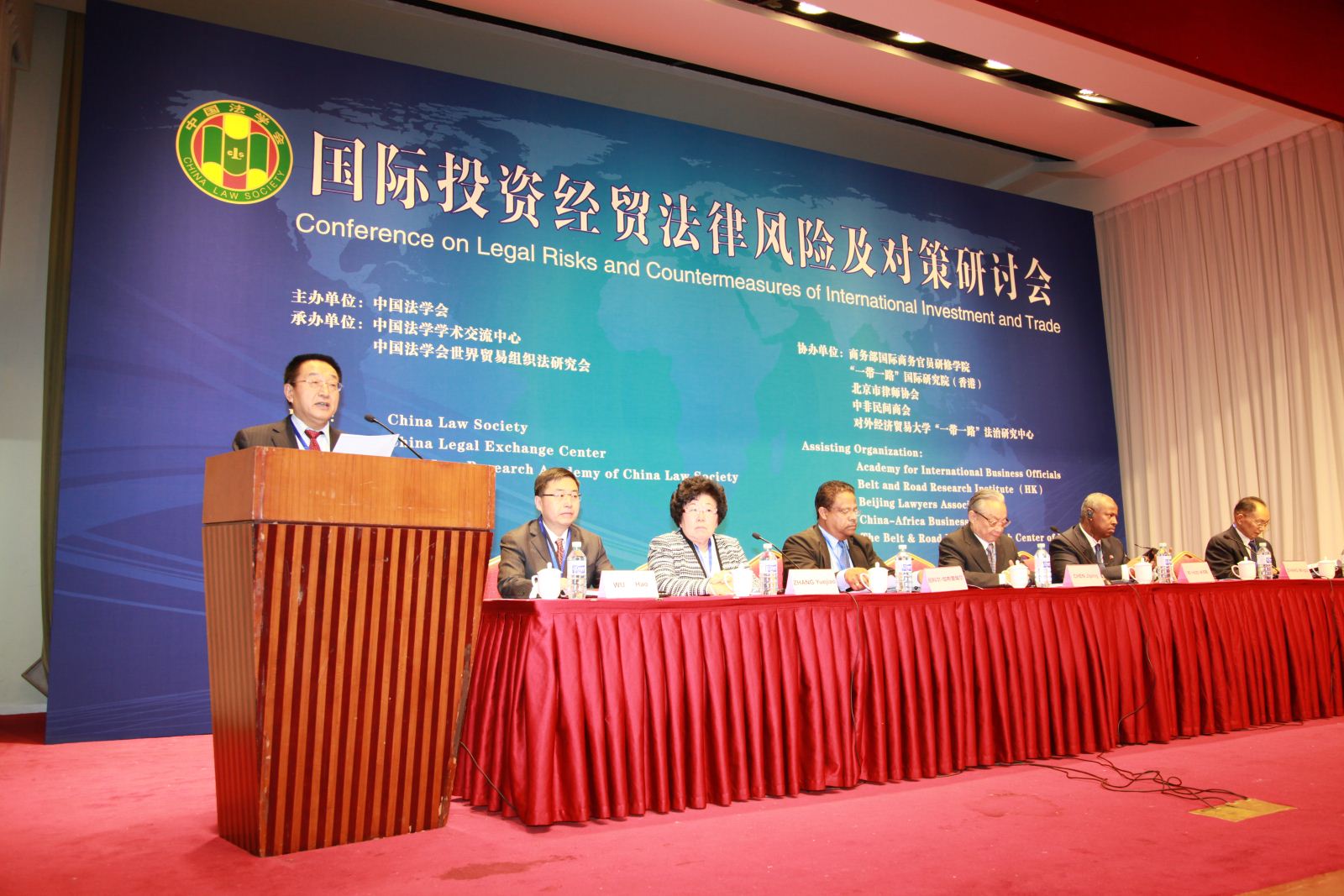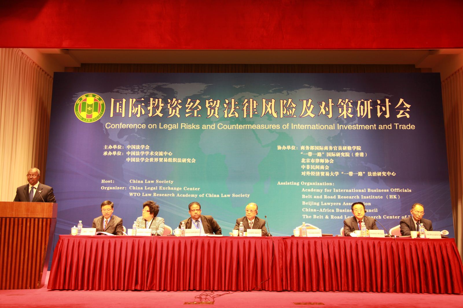 2017年10月12日,由中國法學會主辦,中國法學會世界貿易組織法研究會、中國法學學術交流中心承辦的“國際投資經貿法律風險及對策”研討會在北京隆重開幕。來自中國和亞洲、非洲、歐洲28個國家的180多位法學法律界和工商界代表出席會議。中國法學會黨組書記、常務副會長陳冀平,吉布提共和國駐華大使阿卜杜拉·米吉勒,塞舌爾前民主黨領袖、人權委員會委員尼科爾·加布里埃爾,國務院法制辦政法國防法制司司長、中國法學會世界貿易組織法研究會副會長吳浩在開幕式上致辭。中國法學會副會長、全國人大法律委員會副主任張鳴起主持會議。世界貿易組織上訴機構前任大法官、中國法學會世界貿易組織法研究會學術委員會主任張月姣教授,香港“一帶一路”國際研究院院長王貴國,北京市律師協會會長高子程,對外經貿大學法學院院長石靜霞分別代表有關方面做大會主旨發言。