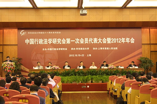 ????????2012年10月20日-21日,中國行政法學研究會第一次會員代表大會暨2012年年會在華東政法大學長寧校區順利召開。本次會議由中國行政法學研究會主辦,華東政法大學承辦,上海市高級人民法院協辦。中國法學會副會長周成奎、最高人民法院副院長江必新、上海市高級人民法院院長應勇以及來自全國人大法工委、國務院法制辦、最高人民法院、北京大學、中國政法大學等單位的300多位專家學者出席此次盛會。會議表決通過了《中國行政法學研究會章程》和《中國行政法學研究會會費標準的決議》,選舉中國政法大學副校長馬懷德教授為中國行政法學研究會會長,會議選舉產生了中國行政法學研究會的理事、常務理事和副會長名單。同時,中國政法大學應松年教授擔任中國行政法學研究會名譽會長和學術委員會主任,朱維究教授擔任中國行政法學研究會顧問。
