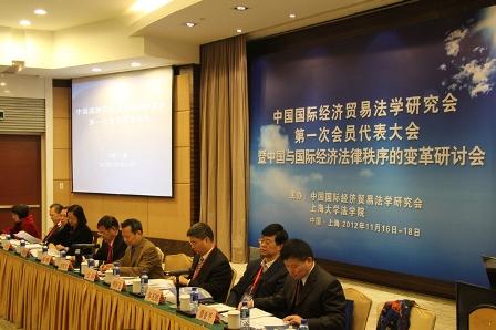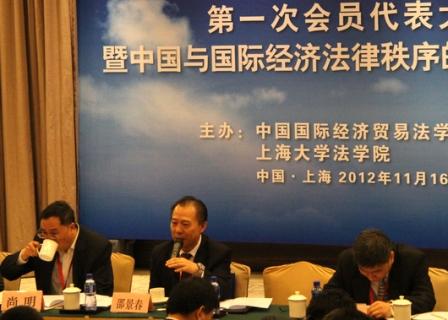 ??????? 2012年11月17日上午八點半,中國國際經濟貿易法學研究會第一次會員代表大會暨中國與國際經濟法律秩序的變革研討會在蘇州同里湖大飯店盛大召開。第一次會員代表大會由中國國際經濟法學研究會會長、上海大學法學院院長沈四寶教授主持。在主席臺就坐的還有中國法學會研究部方向主任、社團管理處劉海燕處長;以及研究會的副會長清華大學法學院車丕照教授、對外經濟貿易大學法學院丁丁教授(兼秘書長)、中山大學法學院慕亞平教授、商務部反壟斷局尚明局長、北京大學法學院邵景春教授、遼寧大學法學院楊松教授、復旦大學法學院張乃根教授、上海財經大學副校長周仲飛教授。本次會議由中國國際經濟貿易法學研究會主辦,上海大學法學院承辦。出新會議的代表共有156名。