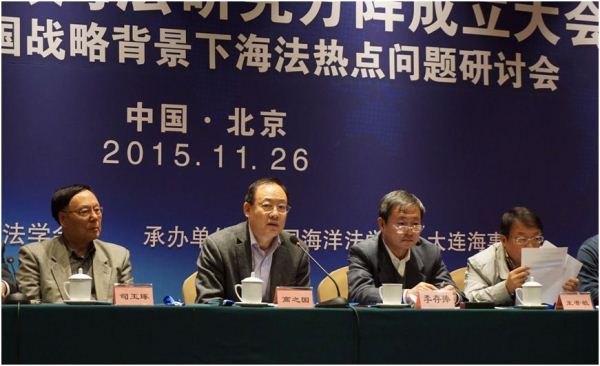 11月26日,“海法研究方陣”成立大會暨海洋強國戰略背景下海法熱點問題研討會在北京中國職工之家飯店舉行。中國海洋法學會會長、我國著名海洋法學家、國際海洋法法庭法官、國家海洋局發展戰略研究所所長高之國研究員,中國法學會研究部副主任李存捧,我國著名海商法學家、原大連海事大學校長司玉琢教授,大連海事大學副校長單紅軍教授,海南大學副校長王崇敏教授,西北政法大學副校長王瀚教授和內地及港澳臺海法領域的知名專家學者參加了會議。成立大會由國家海洋局發展戰略研究所副所長、黨委書記賈宇研究員主持,中國海洋法學會和大連海事大學共同承辦。