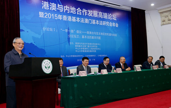 12月5日到6日,由香港基本法澳門基本法研究會、港澳與內地合作發展協同創新中心、中山大學港澳珠江三角洲研究中心和中山大學粵港澳發展研究院共同舉辦的“港澳與內地合作發展高端論壇”暨香港基本法澳門基本法研究會2015年年會在中山大學懷士堂隆重舉行。