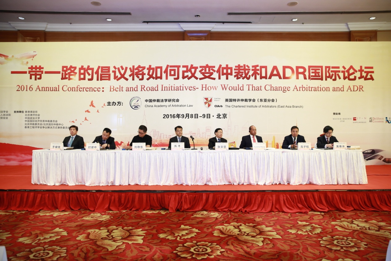 2016年9月8日至9月9日,中國仲裁法學研究會和英國特許仲裁學會在京聯合主辦“一帶一路的倡議將如何改變仲裁和ADR”國際論壇。中國法學會、最高人民法院、中國貿促會領導,香港律政司,北京市律師協會及來自“一帶一路”沿線國家在京駐華使館經濟官員,歐、美、新加坡、港臺及內陸仲裁專家學者近300人參會。
