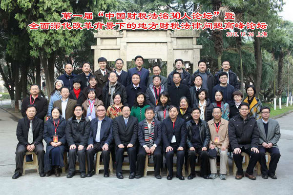 2015年12月26日,在中國法學會指導下,我國法學界第一個“法治30人論壇”,即“中國財稅法治30人論壇”在上海成立,并舉辦了以“全面深化改革背景下地方財稅法治建設”為主題的學術研討會。研討會由中國財稅法學研究會主辦,華東政法大學財稅法研究中心承辦。中國法學會研究部副主任李存捧先生,中國商法學研究會副會長、華東政法大學副校長顧功耘教授,華東政法大學經濟法學院副院長陳岱松教授,中國財稅法學會會長,北京大學劉劍文教授出席了開幕式,并先后致詞。來自北京大學、中國人民大學、中國政法大學、中國社會科學院法學所、上海交通大學、武漢大學、重慶大學、中山大學、暨南大學、湖南大學、鄭州大學、遼寧大學、中南財經政法大學、西北政法大學、天津財經大學、江西財經大學、首都經濟貿易大學、中南民族大學、吉林財經大學等高校和國家稅務總局稅收科學研究所、《稅務研究》雜志社、《中國稅務報》社等部門的專家學者40余人與會,就論壇主題進行了廣泛而深入的探討。