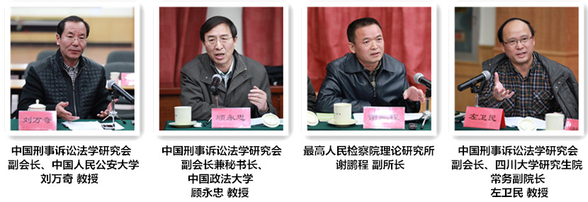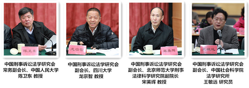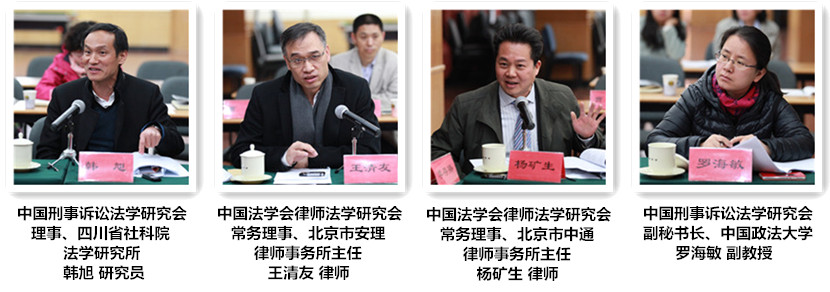 ????????中國刑事訴訟法學研究會常務副會長、中國人民大學陳衛東教授,中國刑事訴訟法學研究會副會長、四川大學龍宗智教授,中國刑事訴訟法學研究會副會長、北京師范大學刑事法律科學研究院副院長宋英輝教授,中國刑事訴訟法學研究會副會長、中國社會科學院法學研究所王敏遠研究員,中國刑事訴訟法學研究會副會長、中國人民公安大學劉萬奇教授,中國刑事訴訟法學研究會副會長兼秘書長、中國政法大學顧永忠教授,最高人民檢察院理論研究所謝鵬程副所長,中國刑事訴訟法學研究會副會長、四川大學研究生院常務副院長左衛民教授,中國法學會律師法學會副會長、民主與法制社劉桂明總編輯,中國法學會律師法學研究會副會長、中國政法大學法學院王進喜教授,中國法學會律師法學研究會副會長兼秘書長、北京市天同律師事務所主任蔣勇律師,中國法學會律師法學研究會副會長、西南科技大學法學院黨委書記廖斌教授,中國刑事訴訟法學研究會理事、四川省社科院法學研究所韓旭研究員,中國法學會律師法學研究會常務理事、北京市安理律師事務所主任王清友律師,中國法學會律師法學研究會常務理事、北京市中通律師事務所主任楊礦生律師,中國刑事訴訟法學研究會副秘書長、中國政法大學羅海敏副教授參加了研討會。