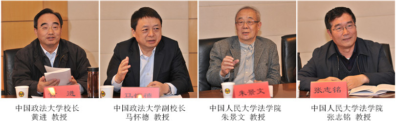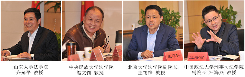 中國法學會副會長、中國國際私法研究會會長、中國政法大學校長黃進教授,中國法學會行政法學研究會會長、中國政法大學副校長馬懷德教授,中國法學會立法學研究會常務副會長、中國人民大學法學院朱景文教授,中國法學會立法學研究會副會長、中國人民大學法學院張志銘教授,中國法學會法理學研究會秘書長、山東大學法學院齊延平教授,中國法學會立法學研究會副會長、中央民族大學法學院熊文釗教授,北京大學法學院副院長王錫鋅教授,中國刑事訴訟法學研究會秘書長、中國政法大學刑事司法學院副院長汪海燕教授參加會議。