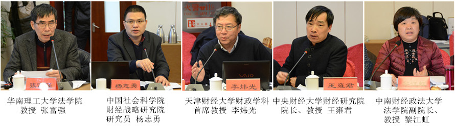 中國法學會財稅法學研究會會長、北京大學法學院教授劉劍文,中國法學會財稅法學研究會常務副會長、武漢大學法學院教授熊偉,中國法學會立法學研究會副會長、中央民族大學法學院教授熊文釗,中國法學會財稅法學研究會副會長、中國政法大學民商經濟法學院教授施正文,中國法學會財稅法學研究會副會長、華東政法大學經濟法學院教授陳少英,中國法學會財稅法學研究會副會長、華南理工大學法學院教授張富強,中國法學會財稅法學研究會副會長、中國社會科學院財經戰略研究院研究員楊志勇,中國財政學會理事、天津財經大學財政學科首席教授李煒光,中國財政學會理事、中央財經大學財經研究院院長、教授王雍君,中國法學會財稅法學研究會常務理事、中南財經政法大學法學院副院長、教授黎江虹,中國法學會財稅法學研究會常務理事、安徽大學法學院教授華國慶,中國法學會財稅法學研究會常務理事、山東工商大學法學院院長、教授張獻勇,中國法學會財稅法學研究會理事、遼寧大學法學院副院長、教授閆海,復旦大學經濟學院教授李維森,中國法學會財稅法學研究會副秘書長、西南政法大學經濟法學院教授陳治等財稅法及相關領域的知名專家學者參加會議并發表修改建議。此外,中國法學會財稅法學研究會副會長、華南理工大學法學院教授蔣悟真提交了書面意見。