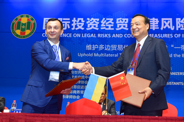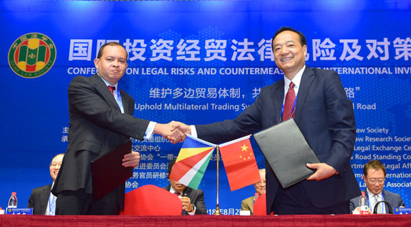 開幕式上,中國法學學術交流中心主任尹寶虎分別與塞舌爾律師協會會長迪威諾·薩比諾、烏克蘭“你與權利”集團公司主席魯斯蘭·列尼夫斯基分別簽署了《雙邊合作備忘錄》。在兩天的時間里,與會法學專家學者圍繞“一帶一路”法律環境與法治保障,經濟全球化與國際經貿規則,境外投資經貿爭端解決機制,境外投資法律風險防控四個專題進行深入交流研討。出席研討會的專家學者還有中國法學會世界貿易組織法研究會會長林中梁、常務副會長楊國華、副會長劉敬東、副會長韓立余、常務副秘書長呂勇,中國法學會相關部門負責人呂興煥、張新寶、肖育斌、楊小平、史學峰、王偉,外交部條約法律司處長項新,北京仲裁委員會副秘書長陳福勇,國際法專家楊松、龔紅柳,涉外律師代表傅軍、任建芝、蒲凌塵、彭俊等。