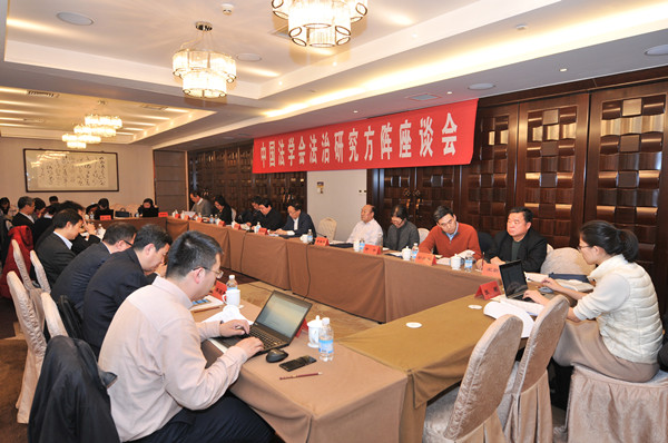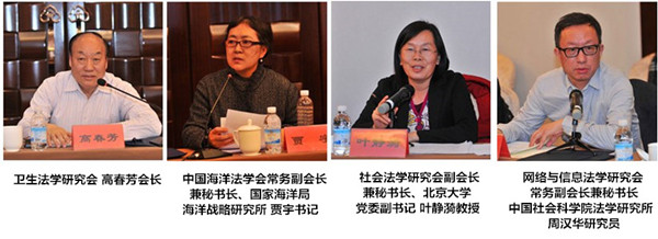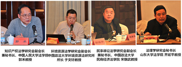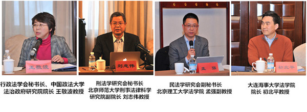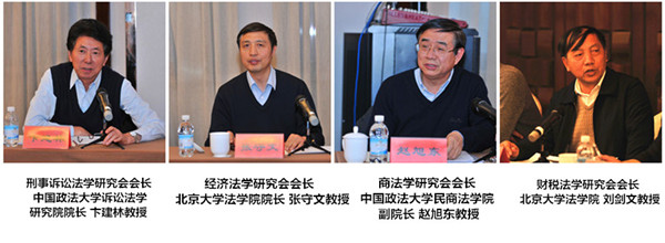 刑事訴訟法學研究會會長、中國政法大學訴訟法學研究院院長卞建林 教授,經濟法學研究會會長、北京大學法學院院長張守文 教授,商法學研究會會長、中國政法大學民商法學院副院長趙旭東 教授,財稅法學研究會會長、北京大學法學院劉劍文 教授,衛生法學研究會高春芳 會長,中國海洋法學會常務副會長兼秘書長、國家海洋局海洋戰略研究所賈宇 書記,社會法學研究會副會長兼秘書長、北京大學黨委副書記葉靜漪 教授,網絡與信息法學研究會常務副會長兼秘書長、中國社會科學院法學研究所周漢華 研究員,知識產權法學研究會副會長兼秘書長、中國人民大學法學院郭禾 教授,環境資源法學研究會副會長、中國政法大學環境資源法研究所所長于文軒 教授,民事訴訟法學研究會副會長兼秘書長、中國政法大學民商經濟法學院宋朝武 教授,法理學研究會秘書長、山東大學法學院齊延平 教授,行政法學會秘書長、中國政法大學法治政府研究院院長王敬波 教授,刑法學研究會秘書長、北京師范大學刑事法律科學研究院副院長劉志偉 教授,民法學研究會副秘書長、北京理工大學法學院孟強 副教授,大連海事大學法學院院長初北平 教授分別代表各研究方陣出席了座談會。