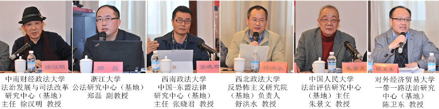 中南財經政法大學法治發展與司法改革研究中心(基地)主任徐漢明教授,浙江大學公法研究中心(基地)鄭磊副教授,西南政法大學中國-東盟法律研究中心(基地)主任、西南政法大學國際法學院張曉君教授,西北政法大學反恐怖主義研究院(基地)負責人舒洪水教授,中國人民大學法治評估研究中心(基地)主任朱景文教授,對外經濟貿易大學一帶一路法治研究中心(基地)、對外經濟貿易大學法學院副院長陳衛東教授匯報了各自研究基地2017年工作開展情況和2018年工作的主要考慮,并對如何進一步加強法治研究基地建設提出了意見建議。