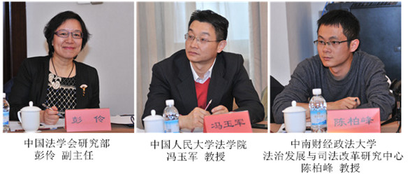 中國法學會研究部副主任彭伶、研究部成果應用處副處長孫立軍,中國人民大學法學院馮玉軍教授、中南財經政法大學法治發展與司法改革研究中心陳柏峰教授參加了本次座談會。