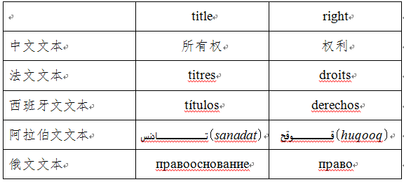 在書面補充材料中,菲律賓詳細對照了五個公約作準文本對“title”和“rights”的本國語言翻譯,參見下表[28]: