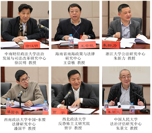 中南財經政法大學法治發展與司法改革研究中心徐漢明教授、海南省南海政策與法律研究中心王崇敏教授、浙江大學公法研究中心朱新力教授、西南政法大學中國-東盟法律研究中心潘國平教授、西北政法大學反恐怖主義研究院賈宇教授、中國人民大學法治評估研究中心朱景文教授先后匯報了各自研究基地2016年工作開展情況和2017年工作的主要考慮,對法治研究基地的建設發展提出了建議。