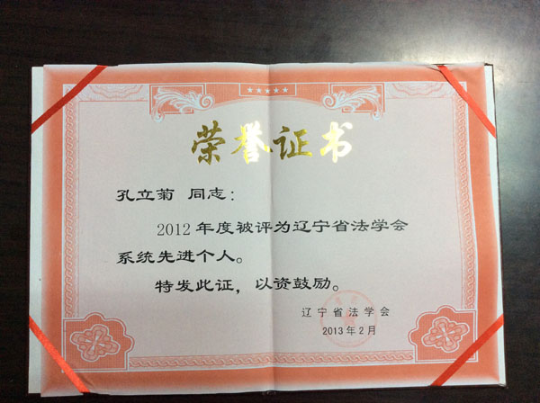 孔立菊榮獲2012年度遼寧省法學會系統先進個人榮譽稱號