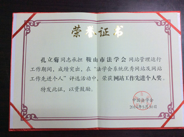 孔立菊在“法學會系統優秀網站及網站工作先進個人”評選活動中榮獲網站工作先進個人獎