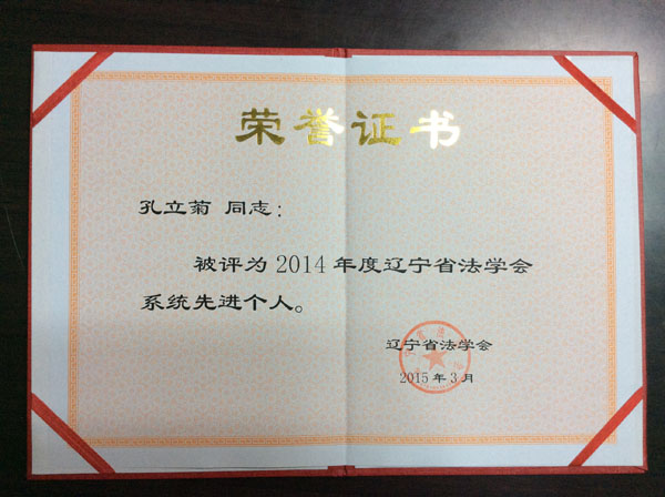 孔立菊榮獲2014年度遼寧省法學會系統先進個人榮譽稱號