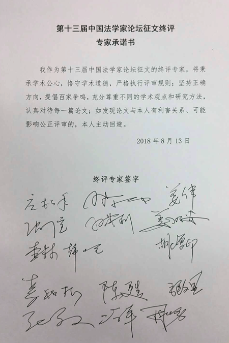 李仕春主任宣讀《第十三屆中國法學家論壇征文終評辦法(草案)》并作相關說明,提交終評委員會審議。終評委員會經充分討論、審議并一致通過了《第十三屆中國法學家論壇征文終評辦法》。呂興煥主任宣讀了《第十三屆中國法學家論壇征文終評專家承諾書》,15位評審專家分別在承諾書上簽名,承諾公平對待每一篇參評論文。