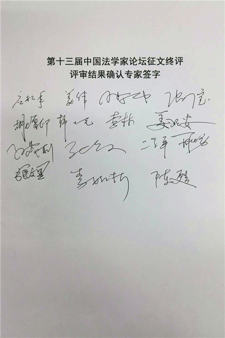 本次評審采取書面匿名方式進行。每組論文隨機產生。評審委員會分為5組,每組3位專家,現場抽簽確定分組,確保每組有1位實務部門的專家。首先,每組3位專家認真審閱;然后,各組內部充分討論后提出各獎項候選論文推薦名單;最后,全體評審專家在張文顯副會長的主持下進行集中審議。經過熱烈的討論,終評委員會評選出擬獲一等獎論文10篇、二等獎論文32篇、三等獎論文59篇、優秀獎論文53篇。經統計,擬獲一等獎數的比例為0.58%,擬獲獎數的比例為9.2%。評審專家現場簽名確認評審結果。