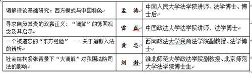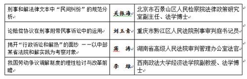 論壇組委會經綜合考慮獲獎論文的選題價值及新穎性,作者的年齡(原則上不超過40周歲)、地域分布和職業等因素,首先從19篇一等獎論文中確定9篇,然后從40篇二等獎論文中確定3篇,共計12篇,作為第七屆中國法學青年論壇報告論文。孟濤博士等12位獲獎論文的作者擔任論壇報告人。論壇組委會對入選論文分為“調解的一般理論和大調解”、“法院調解和人民調解”、“刑事和解、行政訴訟和解及勞動爭議調解”等三類,并將之設置為論壇的三個單元。