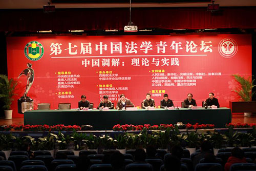 12月22日,以“中國調解:理論與實踐”為主題,由中央政法委員會、最高人民法院、最高人民檢察院、共青團中央作為指導單位,中國法學會主辦,西南政法大學和中國法學會法律信息部共同承辦的第七屆中國法學青年論壇,在西南政法大學隆重舉行。中國法學會黨組成員、副會長李清林,最高人民法院副院長江必新,最高人民檢察院檢委會副部級專職委員童建明、重慶市高級人民法院院長錢鋒、中央政法委綜治二室主任陳顯輝等出席論壇并講話。通過全國征文活動遴選產生的12位青年法學法律工作者,與中央政法委、全國人大法工委、最高人民法院、最高人民檢察院、司法部、中國法學會以及北京大學、清華大學、中國人民大學等高校的知名專家學者,進行了熱烈深入的交流和討論。論壇指導單位、協辦單位的領導、來自法學理論和實踐部門的專家學者、重慶市法學、法律工作者代表和西南政法大學的師生近400人參加了論壇。