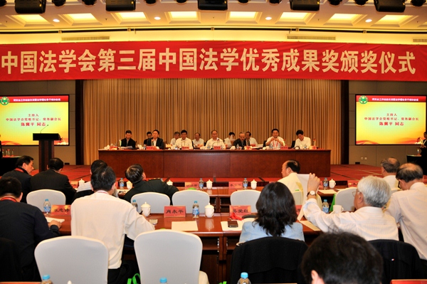 ????????4月25日,第三屆“中國法學優秀成果獎”頒獎儀式在京舉行。中國法學會會長王樂泉,中國法學會黨組書記、常務副會長陳冀平,中國法學會副會長鮑紹坤、張鳴起、張文顯、王其江、姜偉等為獲獎作者頒發獎杯和榮譽證書。