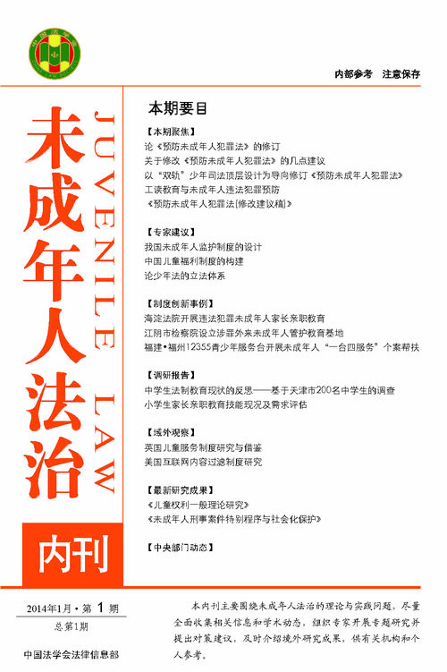 ????????2014年1月20日,在未成年人健康成長法治保障研討會上,經過近半年精心準備的《未成年人法治內刊》創刊號誕生了!至此,中國法學會法律信息部策劃、編輯的“法學法治信息系列專題內刊”(5種)已全部推出,分別是:《食品安全法治內刊》、《一國兩制和基本法內刊》、《司法改革內刊》、《互聯網治理與法制發展內刊》、《未成年人法治內刊》。