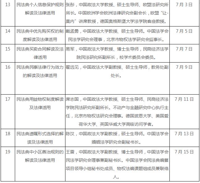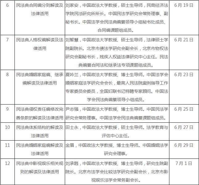 活動分別圍繞民法典總則編、物權編、合同編、人格權編、婚姻家庭編、繼承編和侵權責任編解讀及法律適用展開,同時兼顧大眾關注的法律問題講解,計劃講授21期課程。