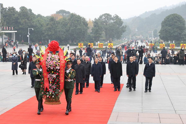 12月12日,王晨一行在湖南韶山向毛澤東同志銅像敬獻花籃。湖南日報?趙持/攝