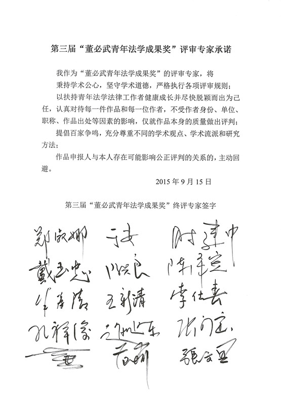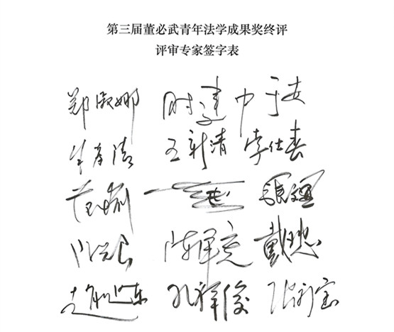 ????????至此,歷時3個半月征集、1個月評審的第三屆“董必武青年法學成果獎”評選活動,已接近尾聲。終評結果將在“中國法學會網”、“中國法學創新網”上進行公示?!岸匚淝嗄攴▽W成果獎”獎勵委員會將以中國法學會的名義,對獲獎者頒發榮譽證書,并邀請中央有關部門的領導同志在第十屆中國法學青年論壇開幕式上進行頒獎。