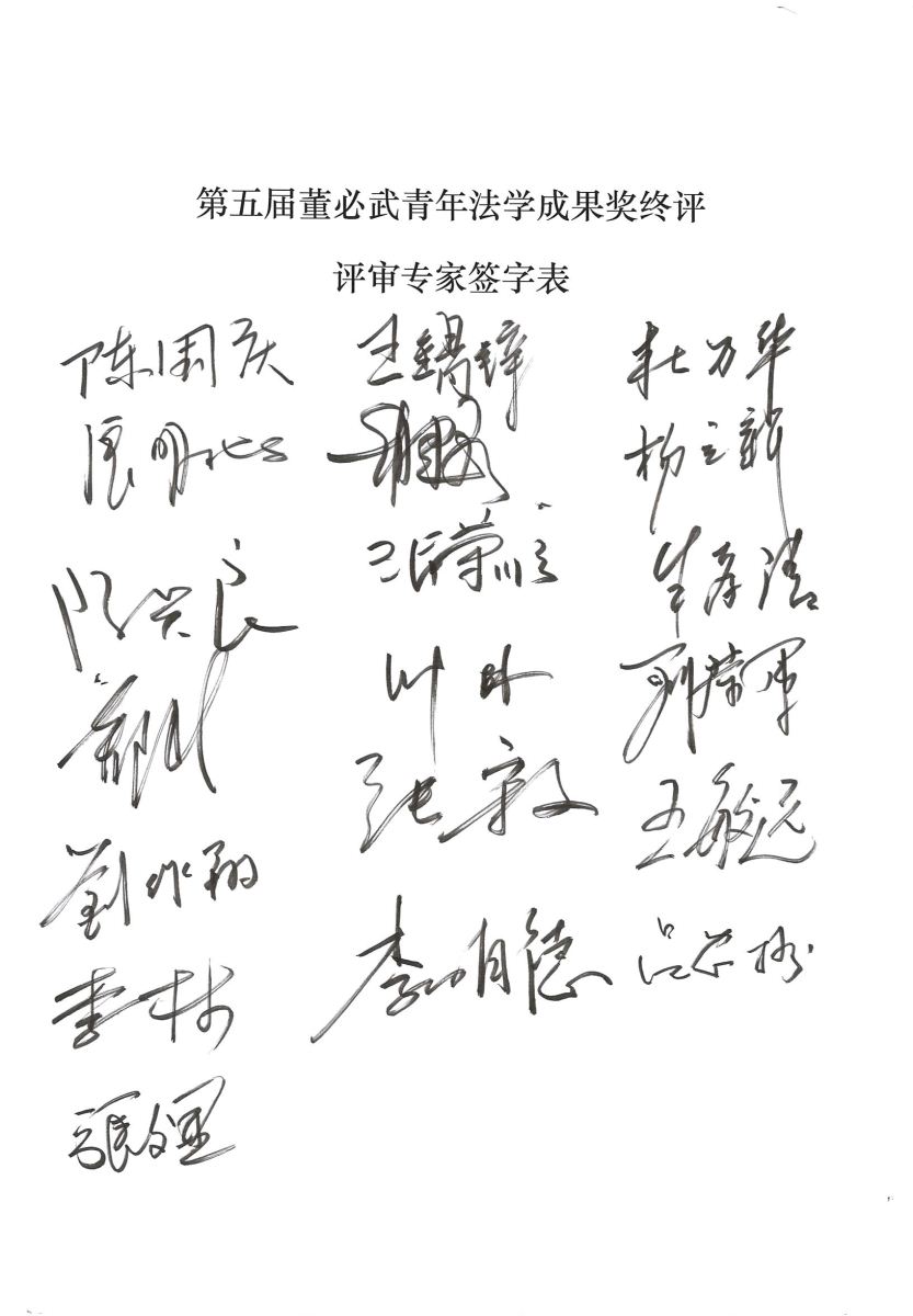 ????????各組推薦名單匯總后,在張文顯副會長的主持下,評審專家們進行了集體討論。先由各小組專家介紹本組推薦作品并闡釋獲獎理由,再由全體專家從不同角度進行評議。隨后,評審委員會全體專家進行無記名投票,確定了擬獲一等獎作品1件、二等獎作品5件、三等獎作品10件、提名獎作品17件。最后,評審委員會全體專家在終評結果上鄭重簽字。終評會歷經三個多小時圓滿結束。終評結果將在中國法學會網、中國法學創新網上公示。