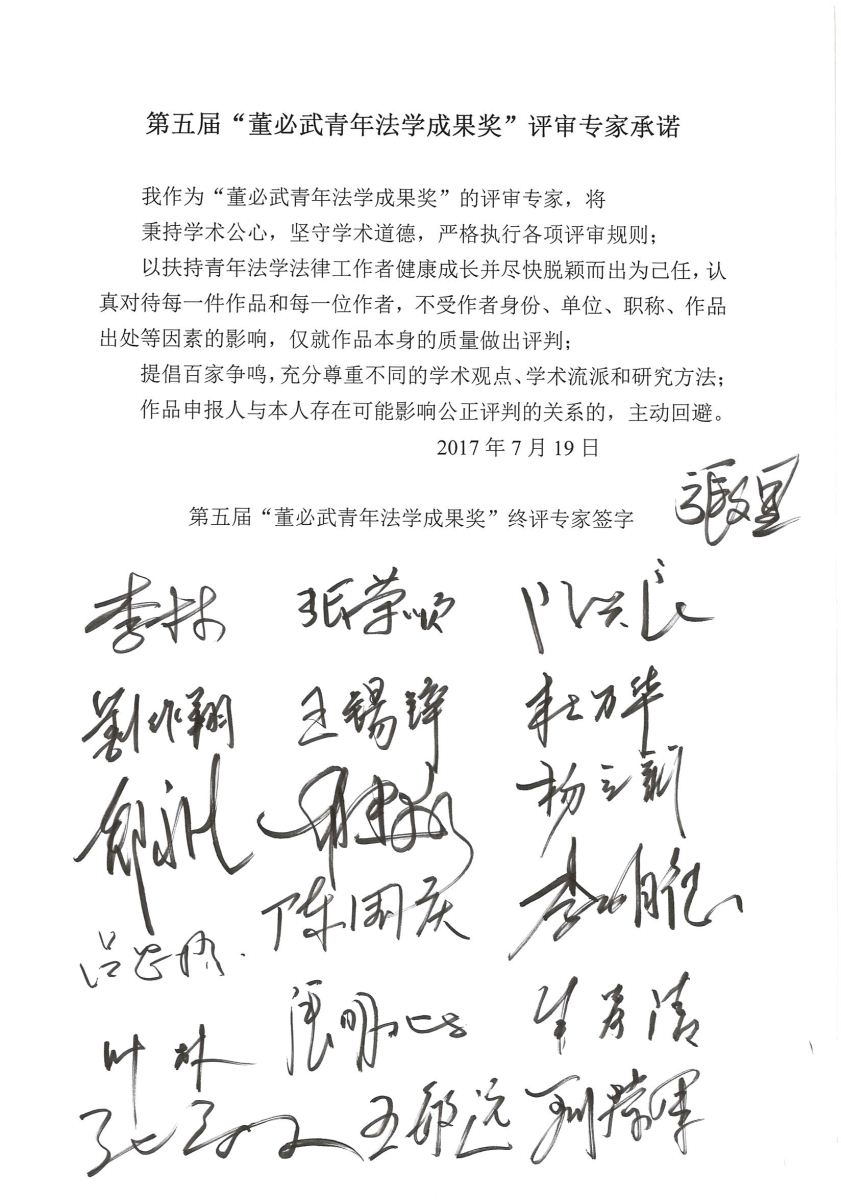 ????????為保證評審工作的公正性和嚴肅性,終評辦法要求評審專家簽署承諾書,保證秉持學術公心,恪守學術道德,認真對待每一件參評作品和每一位作者。浙江大學光華法學院王敏遠教授宣讀了《專家承諾書》,全體評審專家均表示認同并在承諾書上簽名。